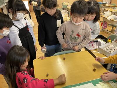 最初は悩みながらも,くるくる回るドングリゴマや,オリジナル松ぼっくりけん玉,マラカスなどの楽器など