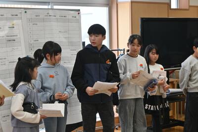 その後、6年生へ感謝する会に向けて、5年生の実行委員から各学級委員へ提案がありました。