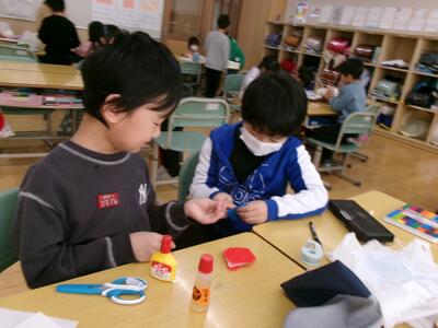 2年生が生活科で作ったおもちゃの作り方を1年生に教え、一緒に作ったり遊んだりしました。