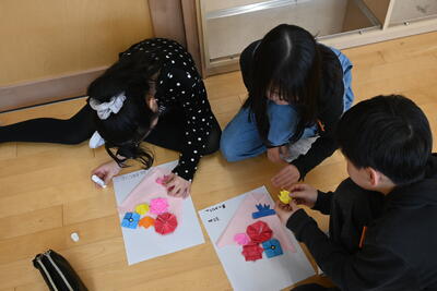 各学年が分担して折ったいろいろな種類の「花」を、1枚の紙の上にデザインして貼り付け、花束を作りました。