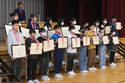 その後、基金会の表彰式が行われ、学習面や運動面で優秀な成績を納めた6年生の児童に、賞状が贈られました。