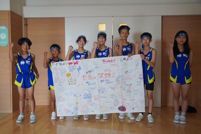 壮行式では、5・6年生からの応援メッセージが書かれたフラックが選手たちに渡されました。