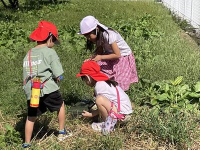 長く伸びたつるを「うんとこしょ,どっこいしょ」と掛け声をかけながらみんなで引っ張ったり,大きなお芋を数人で何分もかけて掘り出したり,楽しく活動しました。